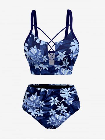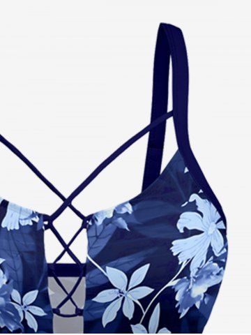 Flower Leaf Plant Print Hawaii Lace Up Tankini Top(Adjustable Shoulder Strap) - Deep Blue - Xxs