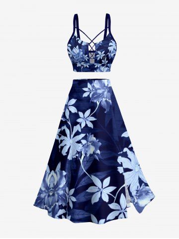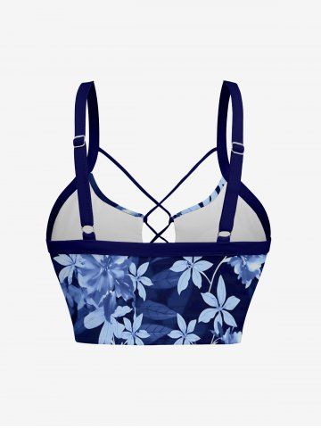 Flower Leaf Plant Print Hawaii Lace Up Tankini Top(Adjustable Shoulder Strap) - Deep Blue - Xs