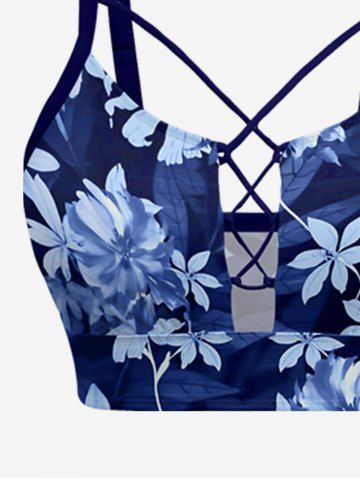 Flower Leaf Plant Print Hawaii Lace Up Tankini Top(Adjustable Shoulder Strap) - Deep Blue - 3x