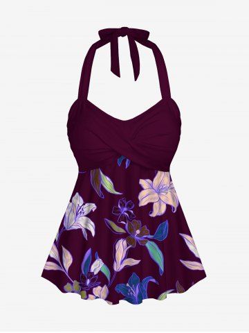 Flower Leaf Print Hawaii Twist Halter Backless Boyleg Tankini Swimsuit - Purplish Red - 1x
