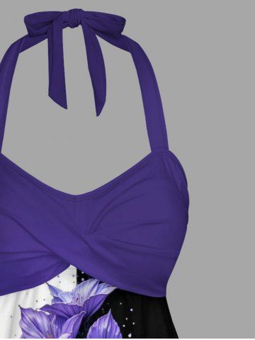 Flower Leaf Print Hawaii Twist Halter Backless Boyleg Tankini Swimsuit - Concord - 6x