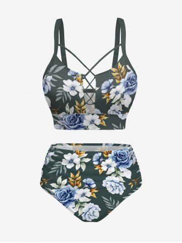 Flower Tropical Leaf Print Hawaii Lace Up Tankini Swimsuit (Adjustable Shoulder Strap) - Deep Green - Xs