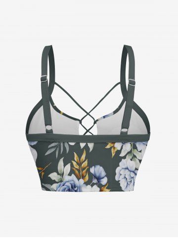 Flower Tropical Leaf Print Hawaii Lace Up Tankini Swimsuit (Adjustable Shoulder Strap) - Deep Green - 1x