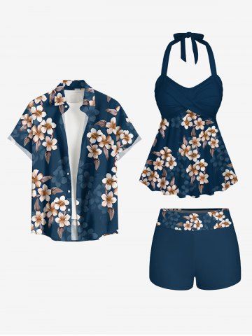 Graphic Swimwear > Leaf Ombre Flower Print Hawaii Twist Halter Backless Boyleg Tankini Swimsuit
