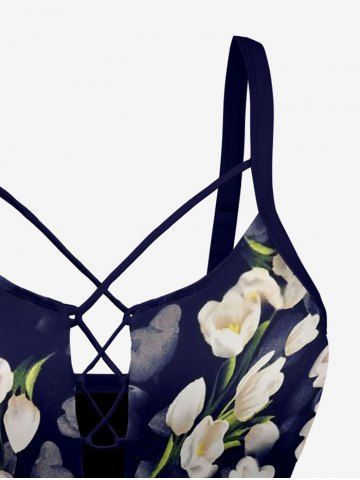 Ombre Flower Print Hawaii Lace Up Tankini Top(Adjustable Shoulder Strap) - Deep Blue - S