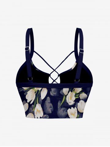 Ombre Flower Print Hawaii Lace Up Tankini Top(Adjustable Shoulder Strap) - Deep Blue - 1x