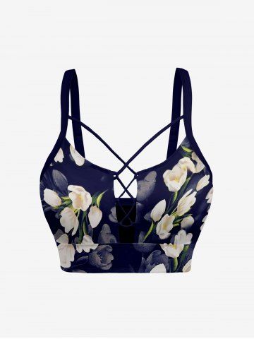 Ombre Flower Print Hawaii Lace Up Tankini Top(Adjustable Shoulder Strap) - Deep Blue - 2x