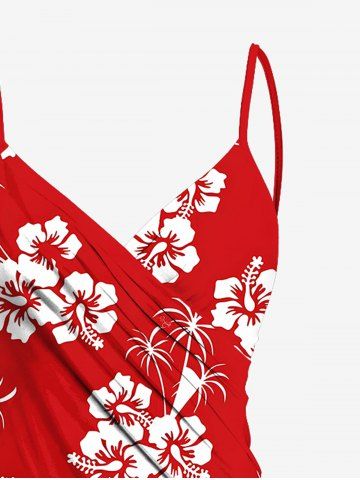 Plus Size Coconut Tree Hibiscus Flower Print Hawaii Convertible Beach Cover Up - Red - S