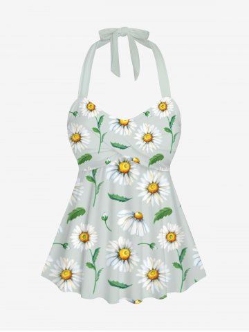 Graphic Swimwear > Plus Size Daisy Flowers Leaf Print Halter Cinched Boyleg Tankini Swimsuit