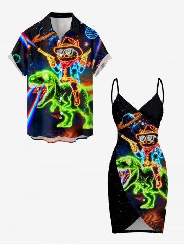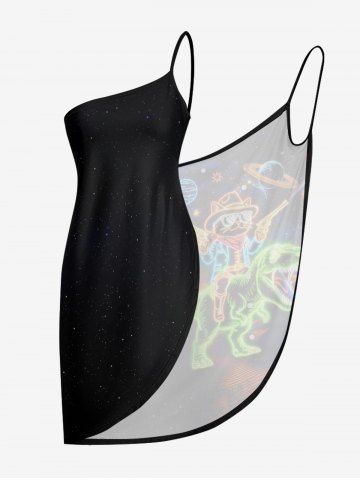 Plus Size Dinosaur Cat Planet Galaxy Print Hawaii Convertible Beach Cover Up - Black - S