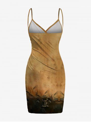 Plus Size Distressed Skull Rose Flower Print Halloween Convertible Beach Cover Up - Tan - Xs
