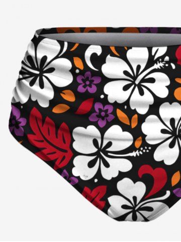 Plus Size Flowers Leaf Print Lace Up Panel Hawaii Tankini Set - Black - L