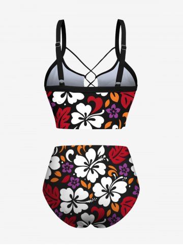 Plus Size Flowers Leaf Print Lace Up Panel Hawaii Tankini Set - Black - 4x