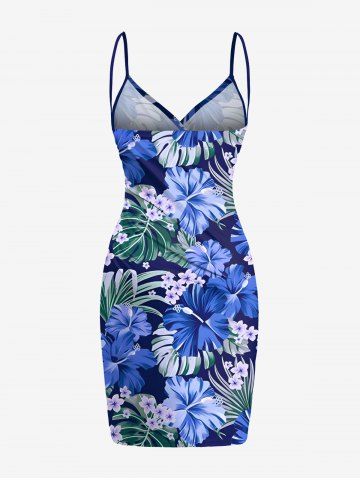 Plus Size Hibiscus Flower Leaf Print Convertible Hawaii Beach Cover - Blue - M