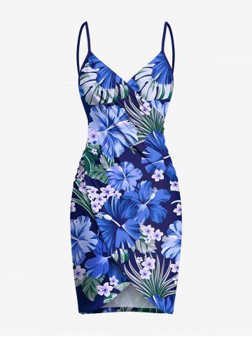 Plus Size Hibiscus Flower Leaf Print Convertible Hawaii Beach Cover - Blue - 4x