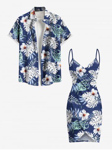 Plus Size Hibiscus Flowers Tropical Leaf Print Convertible Beach Cover - Blue - 1x