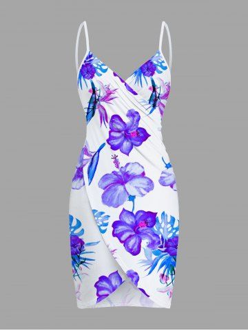 Plus Size Hibiscus Flowers Tropical Leaf Print Convertible Hawaii Beach Cover - White - L