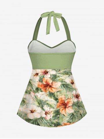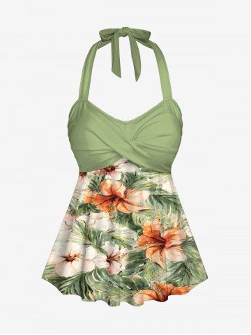 Plus Size Hibiscus Flowers Tropical Leaf Print Halter Cinched Boyleg Tankini Swimsuit - Light Green - S