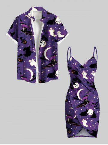 Plus Size Pumpkin Wizard Ghost Moon Star Ombre Galaxy Print Halloween Convertible Beach Cover Up - Purple - 2x