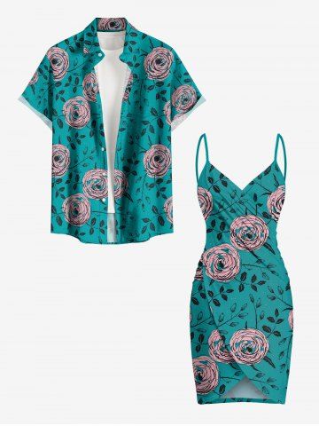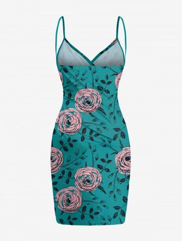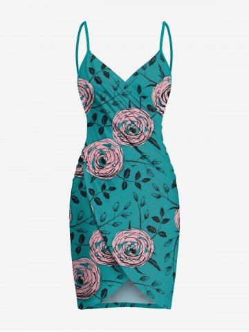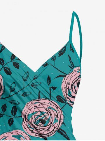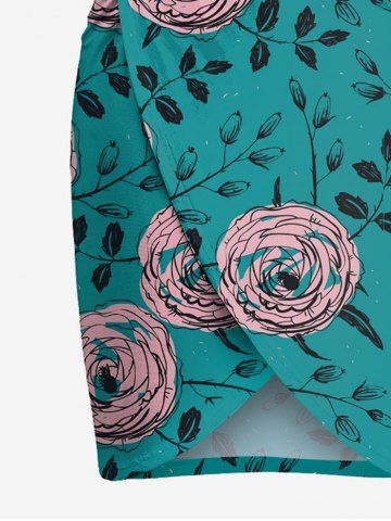Plus Size Rose Flowers Leaf Print Convertible Hawaii Beach Cover - Dark Turquoise - L
