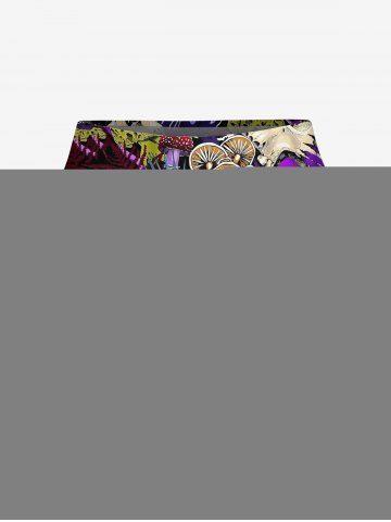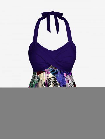 Plus Size Skull Mushroom Tropical Leaf Print Hawaii Twist Halter Boyleg Tankini Swimsuit - Purple - S