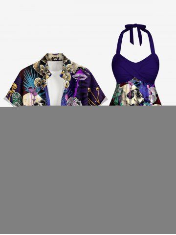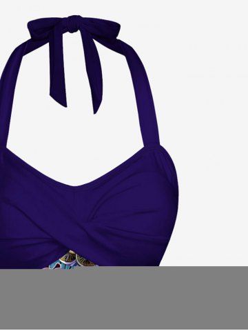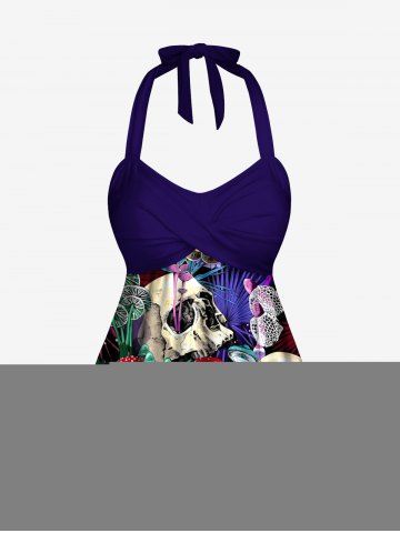 Plus Size Skull Mushroom Tropical Leaf Print Hawaii Twist Halter Boyleg Tankini Swimsuit - Purple - M