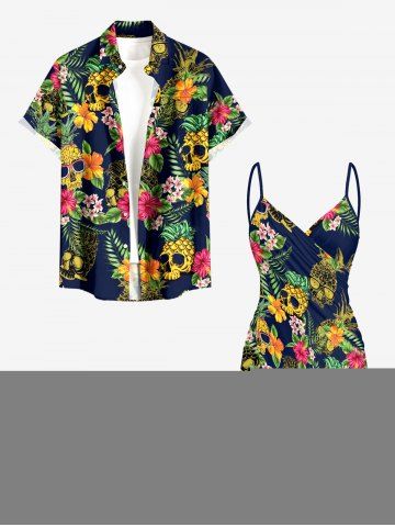 Plus Size Skull Pineapple Tropical Leaf Hibiscus Flower Print Hawaii Convertible Beach Cover Up - Cadetblue - Xs