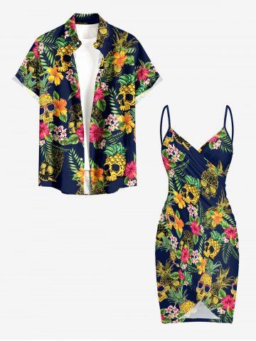 Plus Size Skull Pineapple Tropical Leaf Hibiscus Flower Print Hawaii Convertible Beach Cover Up - Cadetblue - M