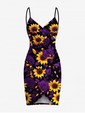 Plus Size Sunflower Rose Flower Print Hawaii Convertible Beach Cover Up - Purple - 2x