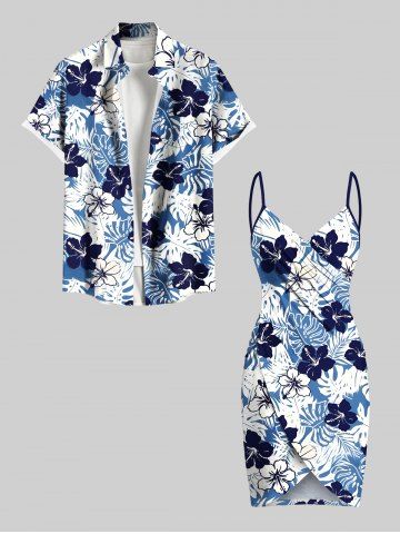 Plus Size Tropical Leaf Hibiscus Flower Print Hawaii Convertible Beach Cover Up - Blue - Xxs