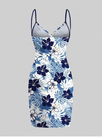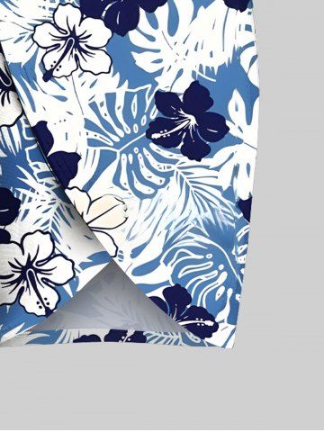 Plus Size Tropical Leaf Hibiscus Flower Print Hawaii Convertible Beach Cover Up - Blue - 2x