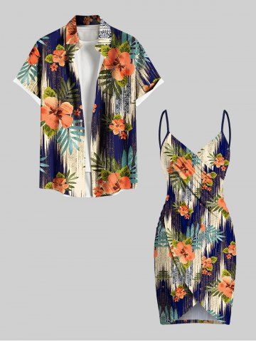 Plus Size Tropical Leaf Hibiscus Flower Waves Print Hawaii Convertible Beach Cover Up - Blue - L