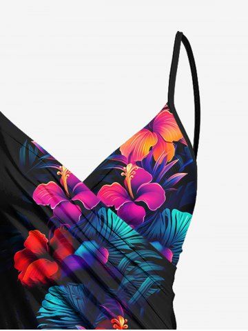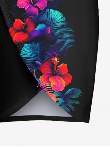 Plus Size Tropical Leaf Hibiscus Flowers Print Convertible Hawaii Beach Cover - Black - Xs