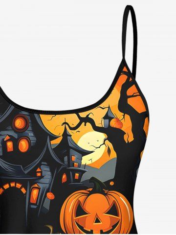 Pumpkin Ghost Castle Tree Moon Print Halloween Boyleg Tankini Swimsuit (Adjustable Shoulder Strap) - Black - M