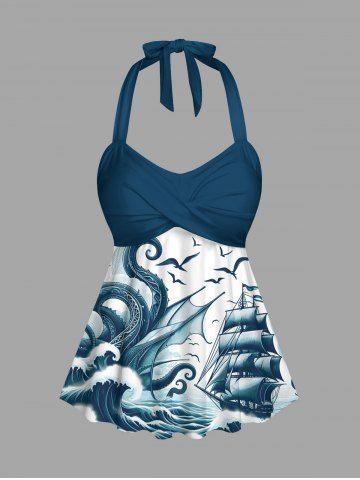 Graphic Swimwear > Sailboat Octopus Sea Waves Bird Print Hawaii Cruise Twist Halter Backless Boyleg Tankini Swimsuit