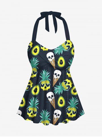 Skull Ice Cream Pineapple Avocado Print Hawaii Twist Halter Backless Boyleg Tankini Swimsuit - Black - M