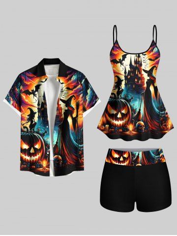 Graphic Swimwear > Skull Pumpkin Wizard Bat Castle Print Halloween Boyleg Tankini Swimsuit (Adjustable Shoulder Strap)