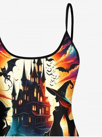 Skull Pumpkin Wizard Bat Castle Print Halloween Boyleg Tankini Swimsuit (Adjustable Shoulder Strap) - Black - L