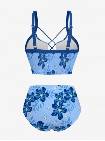 Tropical Leaf Flower Print Hawaii Lace Up Tankini Swimsuit (Adjustable Shoulder Strap) - Sky Blue - 2x