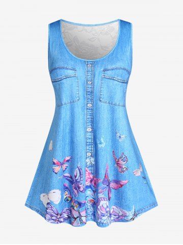 Graphic Tanks > Plus Size 3D Jeans Butterfly Lace Panel Tank Top