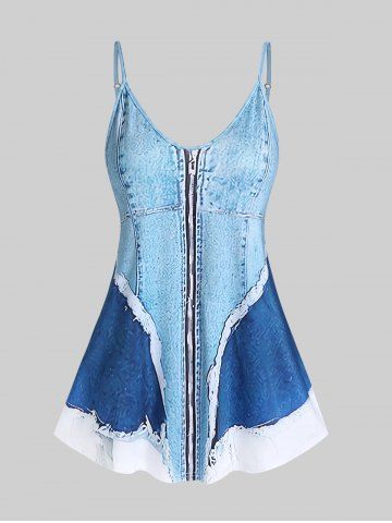Plus Size 3D Jeans Printed Colorblock Tank Top - Light Blue - L