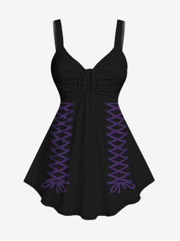 Plus Size 3D Lace Up Print Cinched Tank Top - Black - Xs