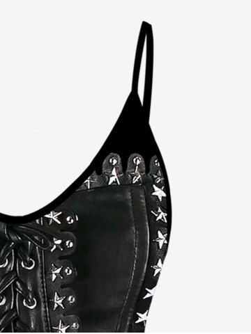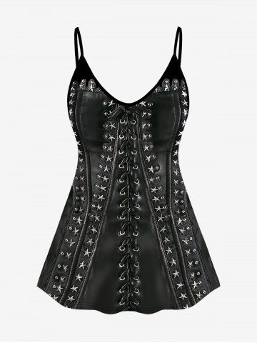 Plus Size 3D Pentagram Grommet Lace Up Print Cami Top(Adjustable Shoulder Strap) - Black - S