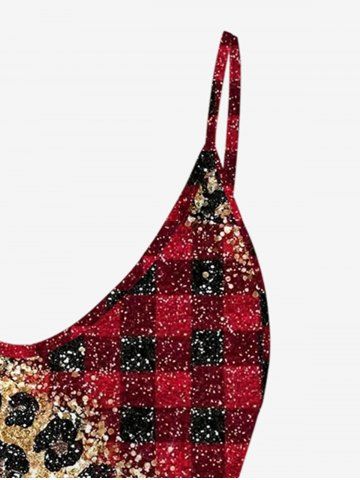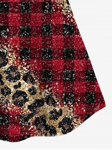 Graphic Tanks > Plus Size 3D Red Black Checkered And Leopard Print Cold Shoulder Tee