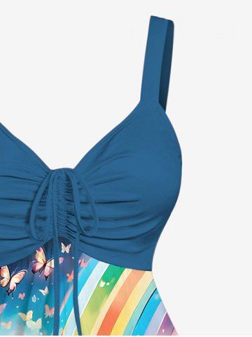 Plus Size Butterfly Flower Rainbow Print Ombre Cinched Backless Tank Top - Blue - 6x