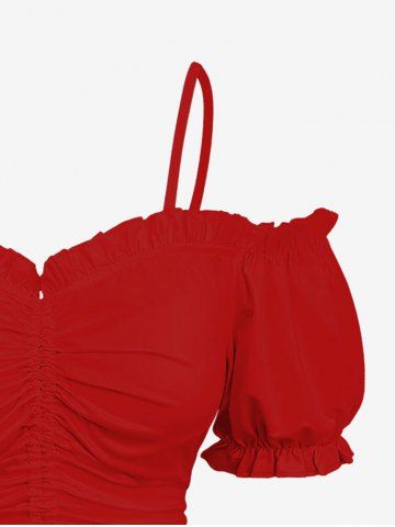 Plus Size Cinched Ruched Ruffles Cold Shoulder Cami Top - Red - M