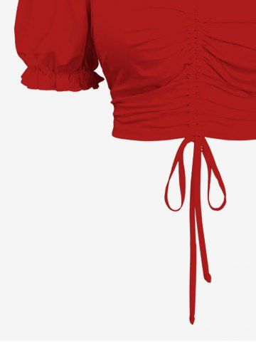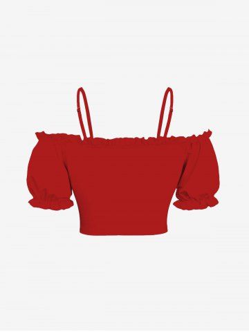 Plus Size Cold Shoulder Puff Sleeves Cinched Solid Ruffles Top - Red - S