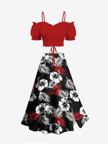 Plus Size Cold Shoulder Puff Sleeves Cinched Solid Ruffles Top - Red - 1x