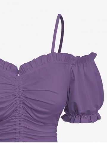 Plus Size Cold Shoulder Puff Sleeves Cinched Solid Top - Light Purple - L