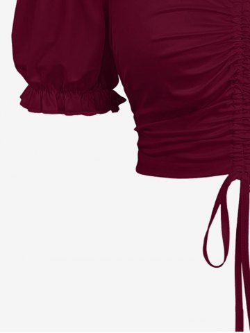 Plus Size Cold Shoulder Puff Sleeves Cinched Solid Top - Red Wine - S
